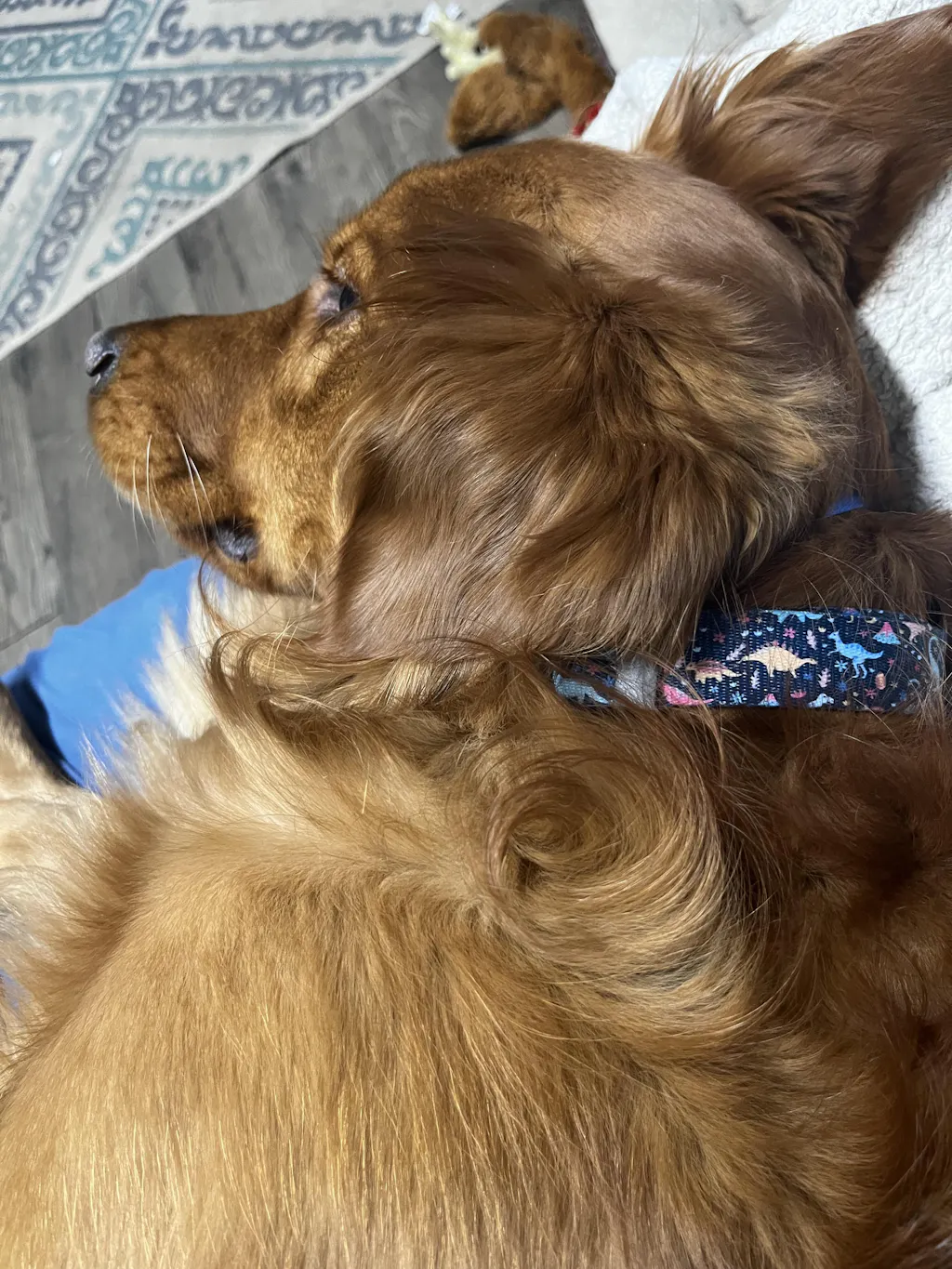 This playful dino print is a great choice for any energetic or playful pup! A beautiful midnight blue with colorful dinos.