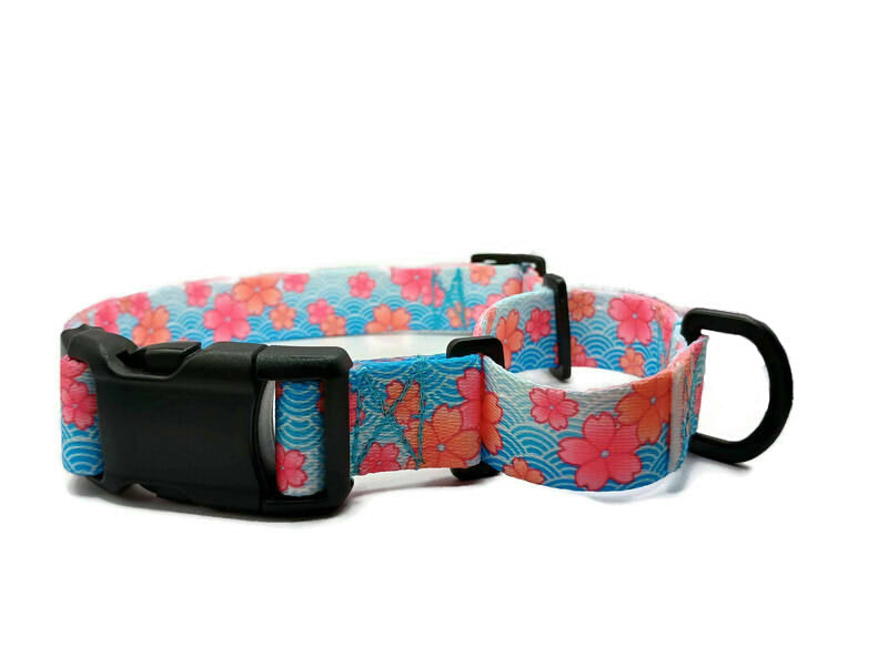 This image displays a beautiful Pink Blossom print on a spring blue background. Unlike our typical metal free TSA martingales, this collar features a quick release buckle in a martingale style for easy on and off! Take the hassle out of adjusting to put it over the head and then fitting to the pups neck. Simply unclip this collar, adjust to size and snap it on! No more adjusting for on and off.