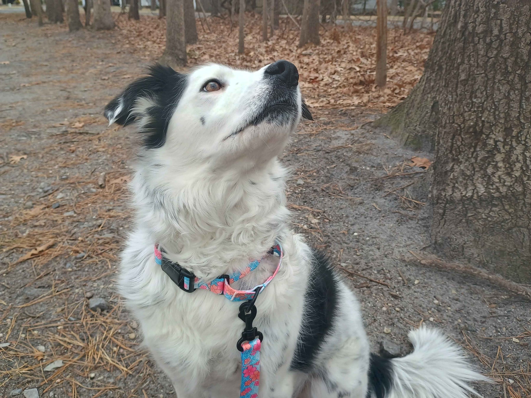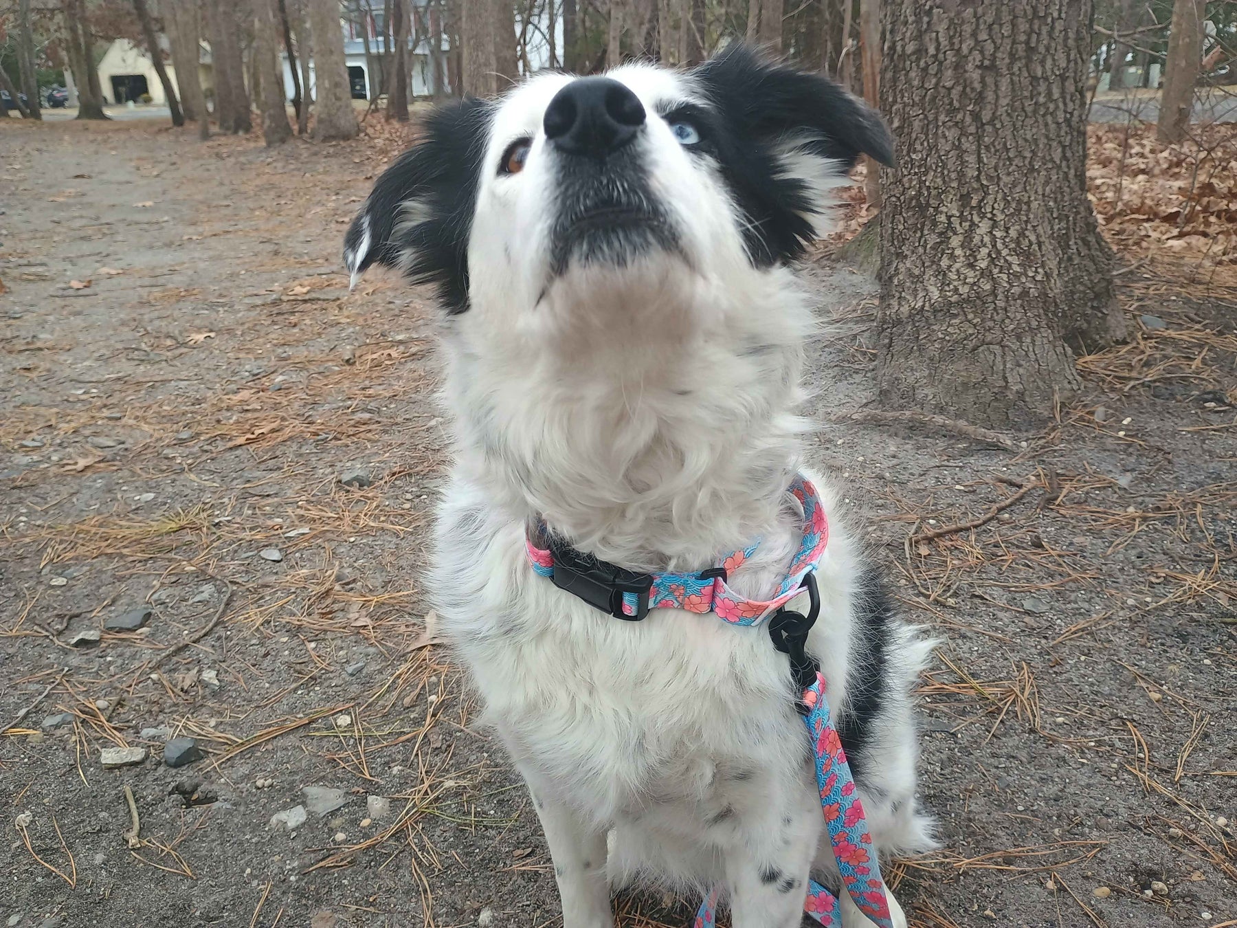 A beautiful female piebald merle border collie wearing a Pink Blossom metal free TSA martingale featuring a quick release plastic buckle with a matching metal free TSA leash. This collar features all plastic hardware with pink blossoms on a spring blue background.