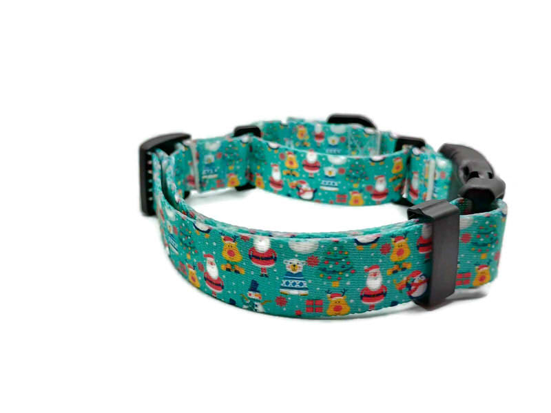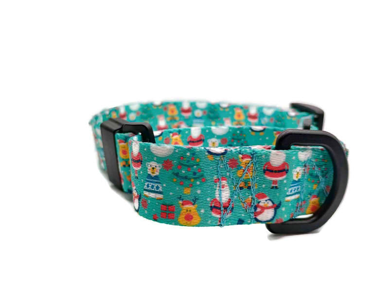 Beautiful blue color with Santa and his friends! Festive and playful.! These are designed purposely for Service dogs at airports that are well behaved and mannered dogs --- these are not recommended or designed to be used on heavy pullers.