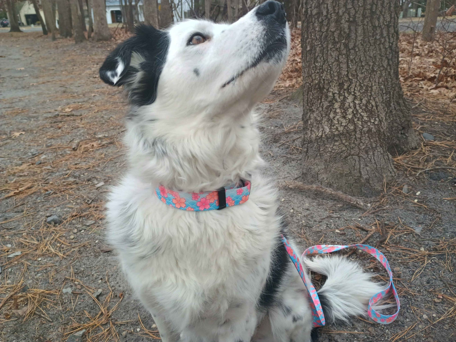 A beautiful female piebald merle border collie showing off our TSA pink Blossom collar & leash! Great for dogs with metal allergies or TSA checkpoints.