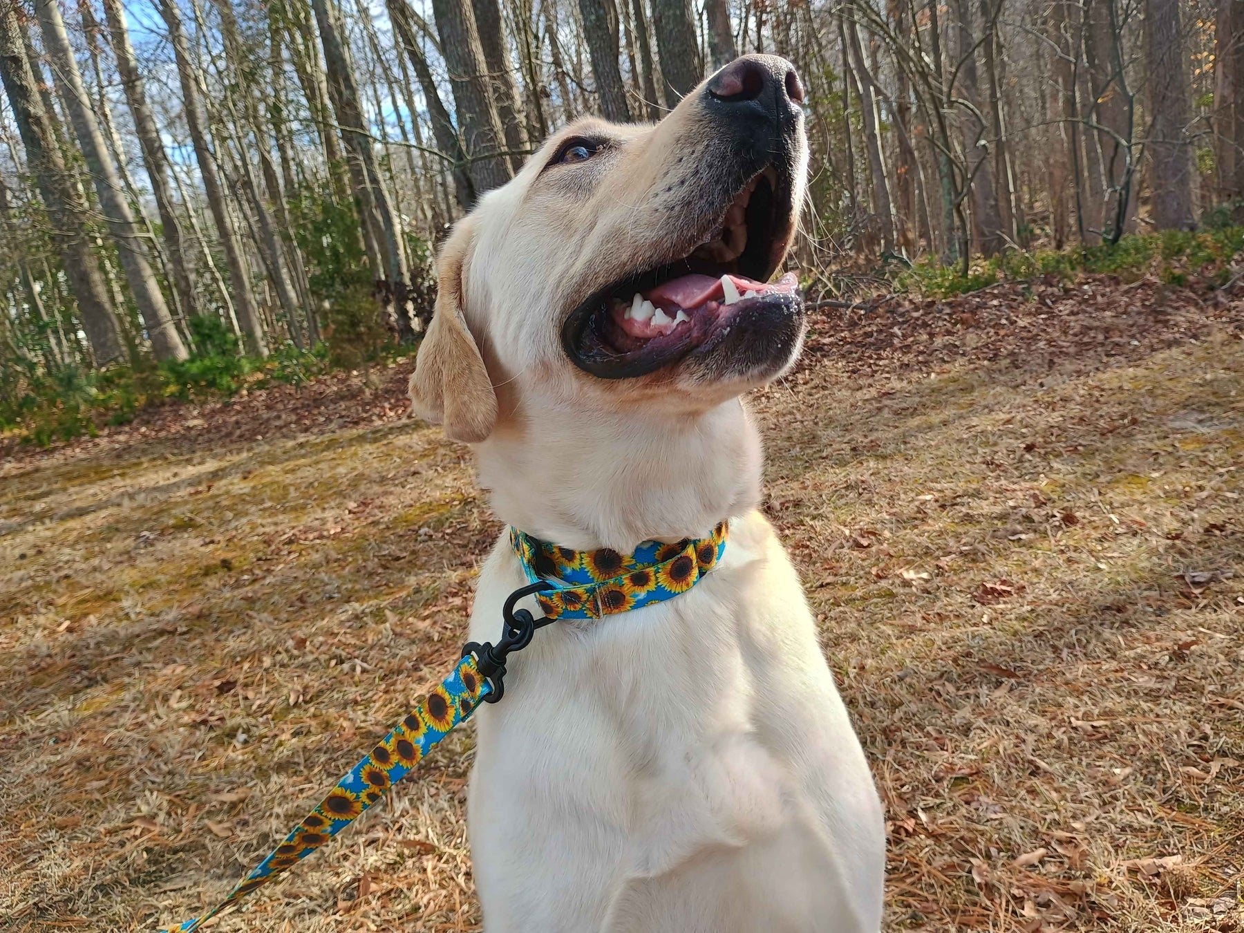 A beautiful female yellow lab wearing a Sunflower Field TSA martingale with a matching leash. A martingale collar featuring all plastic hardware. It has yellow sunflowers on a sky blue background.